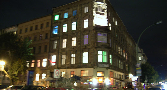 Im vierten Stock lockt außerdem die Zimmerdisco von Dieter Lutsch durch runde, rotierende Körper und die Schwingungen des elektromagnetischen Feldes. Zwei Fenster weiter entwickelt er im Umbau-Raum täglich neue Konstellationen. Darunter im dritten Stock fasziniert sein Vorhang, der sich wie beim Aufziehen bewegt, aber niemals öffnet. "I have hope anyway"- wie ein Leuchtturm im Haus hypnotisieren die Morsezeichen seines Gastes Taro Furukata die Betrachter. |