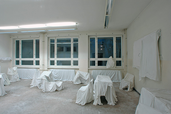 Die Wahrnehmung des Betrachters als ein Spiel: er sieht die Möbelstücke unter den Tüchern, ist programmiert sie zu sehen – beinahe ohne zu hinterfragen – und erweitert den Sinn dieses leeren Raumes. |