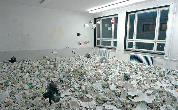 Und die Papierschwalbe beginnt auf einen Berg Papier zu sinken.