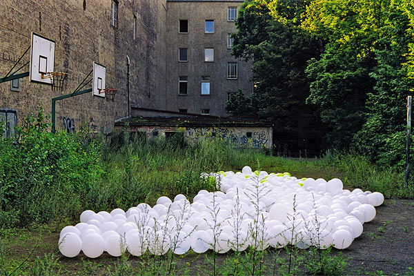 400 Luftballons liegen auf dem Boden, beweglich zusammengebunden.
