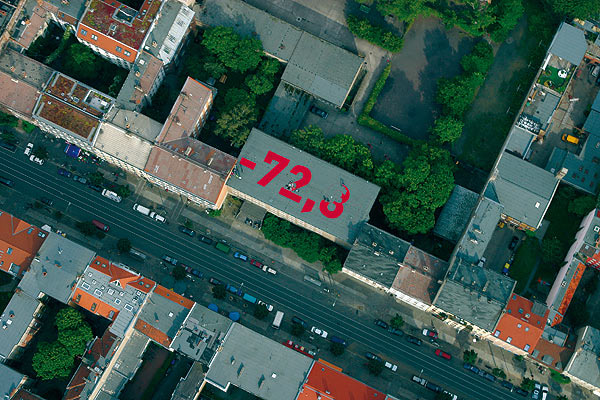Das Dach des leerstehenden Schulgebäudes wurde formatfüllend in Blickrichtung Alex mit roter Straßenmarkierungsfarbe bezeichnet und gibt exemplarisch den erreichten Tiefstand bekannt.